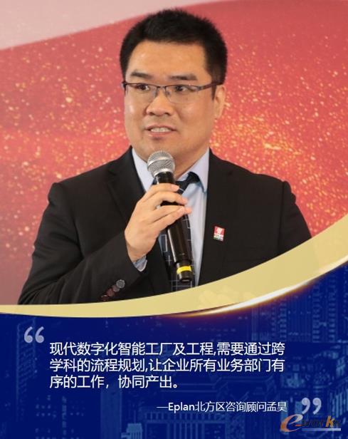 Eplan北方区咨询顾问孟昊带来了Eplan如何助力数字化智能设计与制造的主题演讲。他介绍现代数字化智能工厂及工程现状,分享了Eplan在高效工程设计方面的应用实践,并总结了在软件平台搭建等方面的数字化工程方法论。