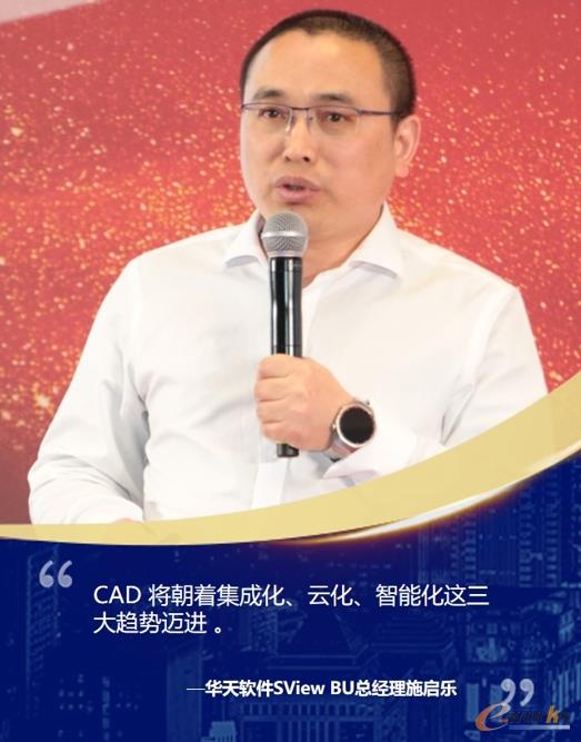 华天软件SView BU总经理施启乐以“3D技术创新,助推中国智造”为题进行了分享,他表示,CAD对于制造企业实现转型和降本增效至关重要。为契合企业数字化转型需求,CAD 的转型势在必行,未来CAD 将朝着集成化、云化、智能化三大趋势迈进 。