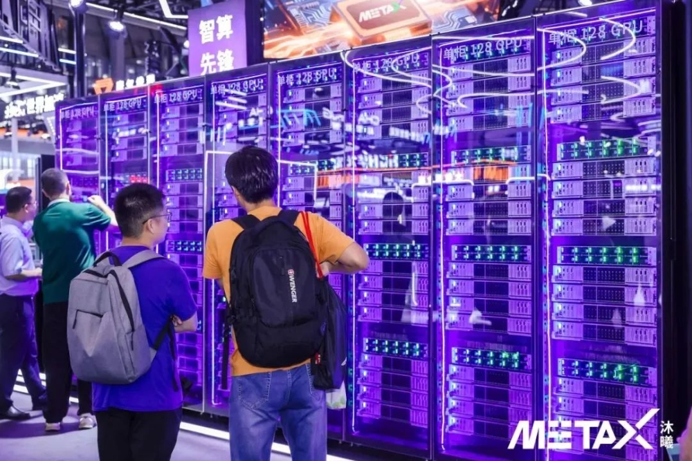 沐曦的四大创新多种超节点——光互连超节点(16-64x GPU)、耀龙3D Mesh超节点(32/64x GPU)、Shanghai Cube 国产高密度液冷整机柜(128x GPU)等也在展会上亮相。Shanghai Cube 国产高密度液冷整机柜采用47U单机柜4组超节点(1组超节点32x GPU、单机柜128x GPU)高密度液冷部署,8机柜并排组成千卡集群;耀龙S8000 G2超节点采用业界首创3D Mesh 互联技术,实现64张曦云C550 通用GPU高速互联的超节点,通信性能提升4倍。